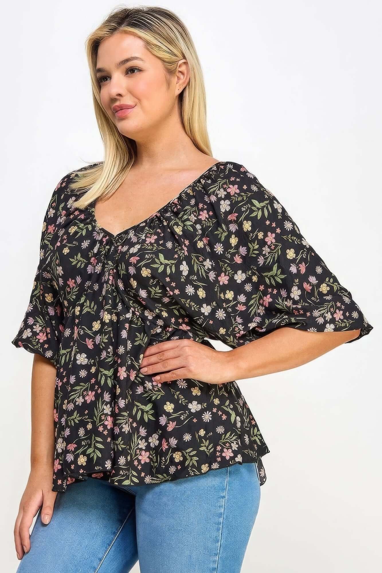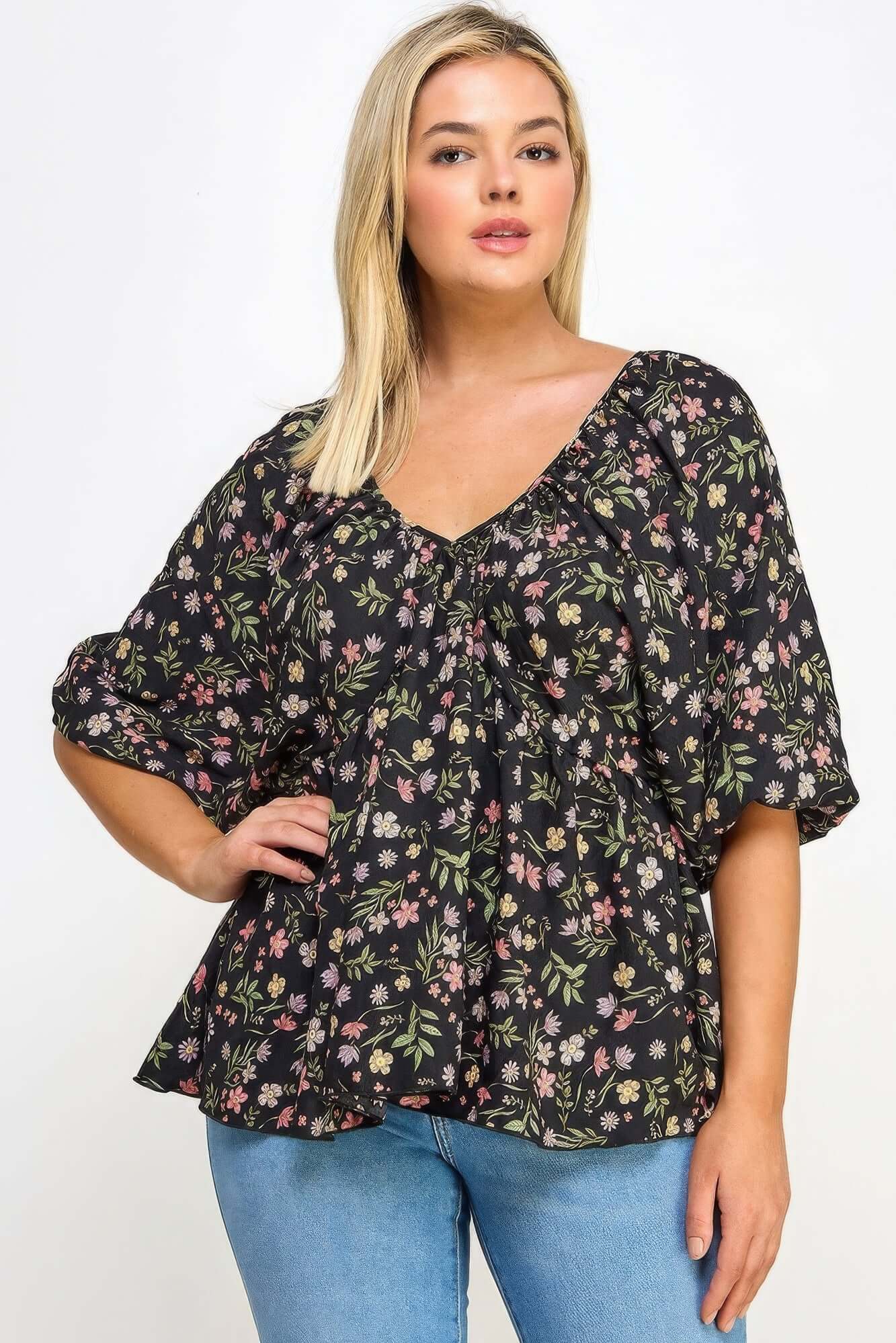 Floral V-neck Babydoll Balloon Slv Top Floral V-neck Babydoll Top – Bargain Buzz