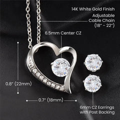Give your loved one a gift that will make their heart swell! The Forever Love Necklace and Cubic Zirconia Earring Set is sure to do the trick.  This necklace and earring pairing provides dazzling sparkle when worn together or separately, and is perfect for any occasion! Do not miss out on this special offering!